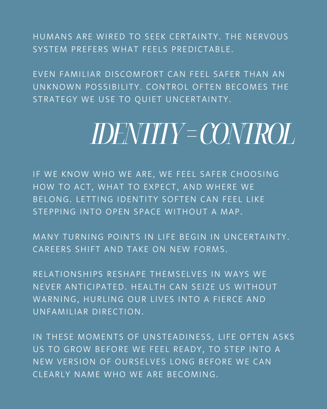 This insight parallels beautifully with Vedānta, which reminds us that the self is not confined to a role, a story, or a particular capacity. Identity belongs to the changing layers of mind and experience, while awareness itself remains fluid and unbound. From a somatic lens, we are living organisms whose capacity for curiosity, connection, and exploration persists, even as the forms through which we express those qualities evolve.